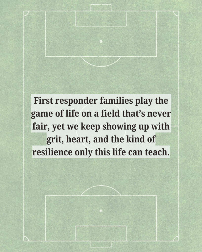 So, to my fellow first responder spouses—keep showing up. Keep lacing up your cleats, even when the field feels tilted against you. Take your rest when you need it, lean on your teammates, and never underestimate the quiet power of resilience. We may not always control the scoreboard, but we can control the heart, grit, and grace we bring to every day. And in the long run, that’s what will carry us—and our families—across the finish line.